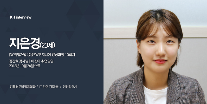 대학교에서 KH정보교육원이 설명회 온 적이 있었어요. 설명회를 들었을 때, 취업에 정말 도움이 많이 되겠구나 라고 생각을 했었어요. 그러다 졸업 전에 KH에서 연락이 왔었는데, 설명회 내용이 생각이 나더라고요. 취업 준비도 해야 하는 저한테 좋을 거 같아서 다른 학원을 알아보지도 않고 여기에 왔어요.(웃음)