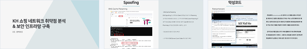 1. 모의해킹을 통한 취약점 진단 2. 방화벽과 네트워크 장비를 이중화하여 가용성 보장 3. Cron과 Rsync, Rsyslog, Logrotate를 이용한 데이터 백업 4. UTM, WAF, NAC, IDS, IPS, ESM 등 보안 솔루션 구축 및 운영 |