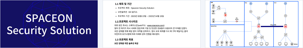 SPACEON 회사는 얼마 전 해커가 회사 서버에 침입하여 기밀 및 민감한 정보가 유출되어 큰 피해를 입었다. 보안 강화를 위해 해킹 방어 대책을 강화하고, 정보 보호 체계를 다시 재 구축 해달라는 클라이언트의 요구사항에 따라 진행해보았다. |