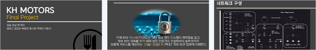 온라인 차량 판매 업체 ‘KH 카센터’는 국내외 할 것 없이 온라인 차량 판매 시장 3년 연속 연간 최다 판매량을 갈아 치우는 기록을 세웠다. 이후 ‘KH MOTORS’로 사업을 확장시켜나가던 중 회원 정보 46만건이 유출되는 문제가 발생하였다. 이에 따라 ‘KH MOTORS’는 개인 정보 관리 시스템의 취약점을 잡고, 정보 보안 강화를 하기 위해 보안 전문가의 컨설팅부터 솔루션까지 맞춤형 서비스를 제공하는 ‘오(늘) 점(심) 뭐 (먹조)’ 정보 보안 업체에 의뢰한다. |