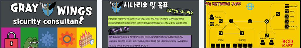보안 체크리스트 기반으로 솔루션 설계 각 부서별 Vlan을 통한 네트워크 망 분리로 보안성을 강화 load balancing / 게이트웨이 이중화를 통한 고가용성 보장 및 부하 분산 VPN을 통해 본사와 지점간의 터널링 구축 본사 인트라넷으로 지사 내부 네트워크의 서버들을 지점과 공유 UTM, WAF, IPS 등의 보안 솔루션 강화를 통한 침입 방지 예방 및 보안성 강화 다양한 모의해킹 기법을 통해 기업의 취약점 발생 예방 |