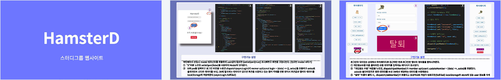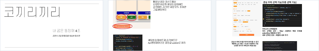 - 공용 컴포넌트(댓글, 게시글 작성, 페이징 등)를 제작하여 코드를 효율적으로 관리 - 지도 및 날씨 API 사용 - 캘린더 및 쪽지 채팅 기능 직접 구현 - 게시판 작성 및 게시판 테이블 리액트 라이브러리 사용하여 구현 |