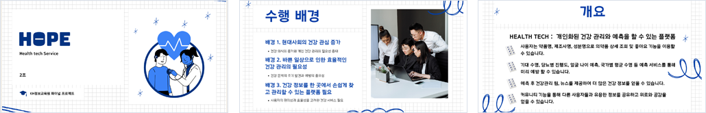 - 프로젝트 기간 : 2024.01.22 ~ 2024.02.21 - 프로젝트 명 : HOPE - 기획 배경 : 모든 연령대의 사용자들이 쉽고 빠르게 건강에 관한 의사 결정을 할 수 있도록 돕는 것을 목표로 한다. - 기대 효과 : 빠르고 정확한 의약품 추천을 통해 개인의 건강을 지원. |