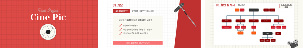 - 프로젝트 기간 : 2024.01. ~ 2024.02. - 프로젝트명 : 씨네픽(cine + pic) - 기획 배경 : 사용자 맞춤 영화 추천 및 커뮤니티를 활용한 영화 플랫폼 구축 - 기대 효과 : 사용자의 선호도에 맞춘 영화를 추천하고, 커뮤니티를 활용해 영화에 대한 모임 및 추천을 통해 영화산업에 대한 관심도 증가 |