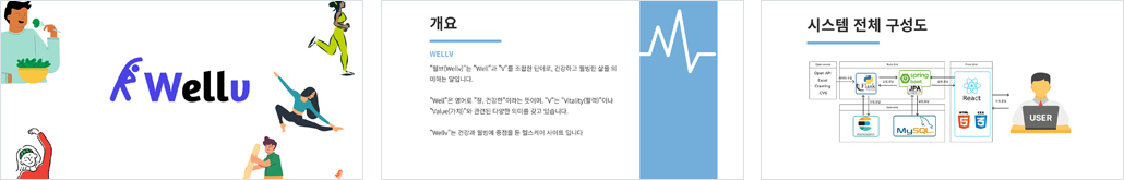 - 프로젝트명 : Wellv - 기획 배경 : 운동과 건강관리에 어려움과 번거로움을 느끼는 현대인을 위한 사이트 - 기대 효과 : 운동, 건강관리에 대한 관심은 항상 컸고 시간이 지날수록 그에 대한 관심과 인기가 커지고 있다. 하지만 이에 어려움과 번거로움을 느끼는 사람이 많기 때문에 이런 이유로 많은 이용자들이 유입될 것으로 예상됨 |
