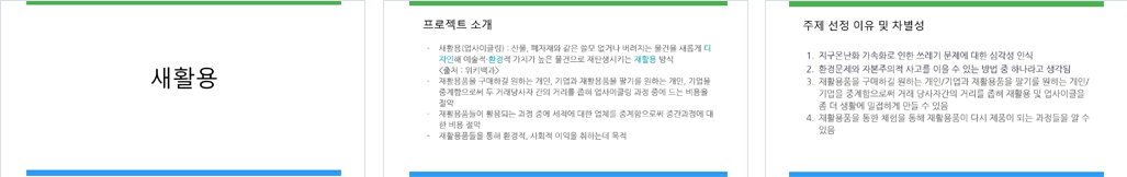 지구온난화로 환경문제가 심각해지는 가운데 생활 속에서 재활용품을 활용해 다시 사용할 수 있는 새활용 제품을 만드는 사람들을 알게되고 서로의 이득에 맞게 재활용품과 새활용제품을 거래해서 환경에 기여하고 재활용품을 팔고 싶어 사람과 사고싶어 하는 사람, 재활용품을 이용해 새활용품을 만들어 팔고 싶은 사람과 사고 싶은 사람을 중계해주는 서비스를 제공한다. 추가로 재활용품 활용 방안을 체험단을 통해 체험해 볼 수 있는데, 체험단을 제공하고 싶은 사람/기업과 체험하고 싶은 사람을 중계한다. |