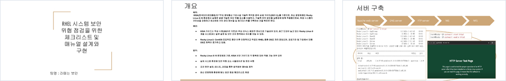 7. 보안 체크리스트 및 대응 매뉴얼 제작 - 항목별 취약점 설명, 발생 가능한 위협 사례 수록 - 각 보안 설정에 대한 적용 방법과 점검 절차 명시 - 실무 적용을 고려한 문서화 (PDF/한글 문서 및 스크립트 포함) |