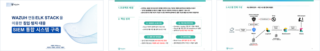 6. 보안 운영의 확장성과 지속 가능성 확보 :시스템 구성요소는 Crontab, rsync, Wazuh 등 자동화 가능한 기술 중심으로 구성되어 있으며, 수동 개입 없이도 보안 탐지-분석-대응이 순환되도록 설계한다. 이를 통해 향후 확장, 정책 업데이트, 백업 서버 교체 등의 유지관리 작업이 간단히 이뤄질 수 있도록 하며, 실제 운영 환경에서도 안정적인 보안 정책 유지가 가능하도록 구현한다. |