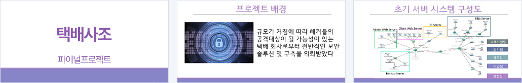 프로젝트 목적(배경) 규모가 커짐에 따라 해커들의 공격대상이 될 가능성이 있는 택배회사로부터 고객, 직원DB와 웹, 네트워크 공격에 대한 보안을 위해 전반적인 보안 솔루션 및 구축을 의뢰받았다.