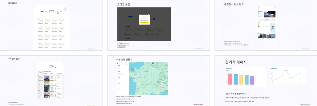 조** : 1.Google Places API를 활용한 도시 검색 및 선택 2. Google Maps API 연동 3. Flatpickr를 활용한 여행 시작 및 종료 날짜 설정 4. 일정 추가 및 일정 관리 (수정, 삭제)