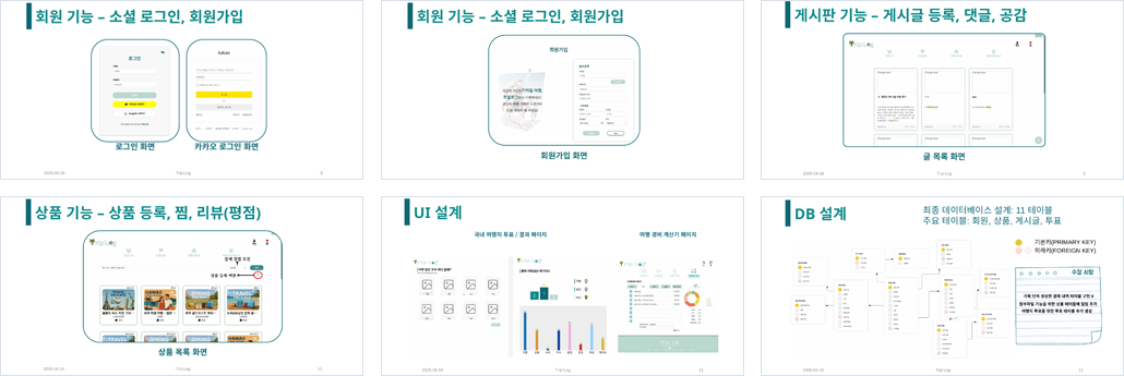 | 구현기능 | 회원 기능 - 회원 정보 등록 / 수정 / 삭제 - 소셜로그인 : 카카오 / 구글 상품 기능 - 상품 정보 등록 / 수정 / 삭제 - 상품 정보 검색 및 정렬 기능 - 상품 찜 / 리뷰 기능 커뮤니티 기능 - 게시글 + 게시글 등록 / 수정 / 삭제 / 조회 + 게시글 공감 기능 + 글 상세 네비게이터 바 - 댓글 + 댓글 등록 / 수정 + 댓글 공감 투표 기능 - 여행지 투표 등록 / 수정 여행 경비 계산 기능 - 인원수에 따라 1/N금액 계산 - 각 카테고리 별 금액 비율 산출 |
